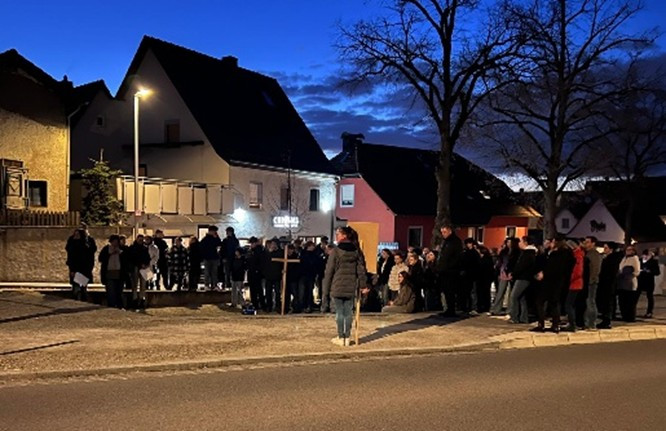 Auch in diesem Jahr nahmen mit mehr als 100 Teilnehmern – darunter über 70 Firmlinge und Konfirmanden aus Hirschaid und Sassanfahrt – wieder eine beeindruckende Zahl an Menschen am diesjährigen Ökumenischen Jugendkreuzweg teil. Er führte diesmal von St. Vitus in Hirschaid über St. Johannis in der Regnitzau zum Dorfplatz in Sassanfahrt und weiter zur Pfarrkirche St. Mauritius.